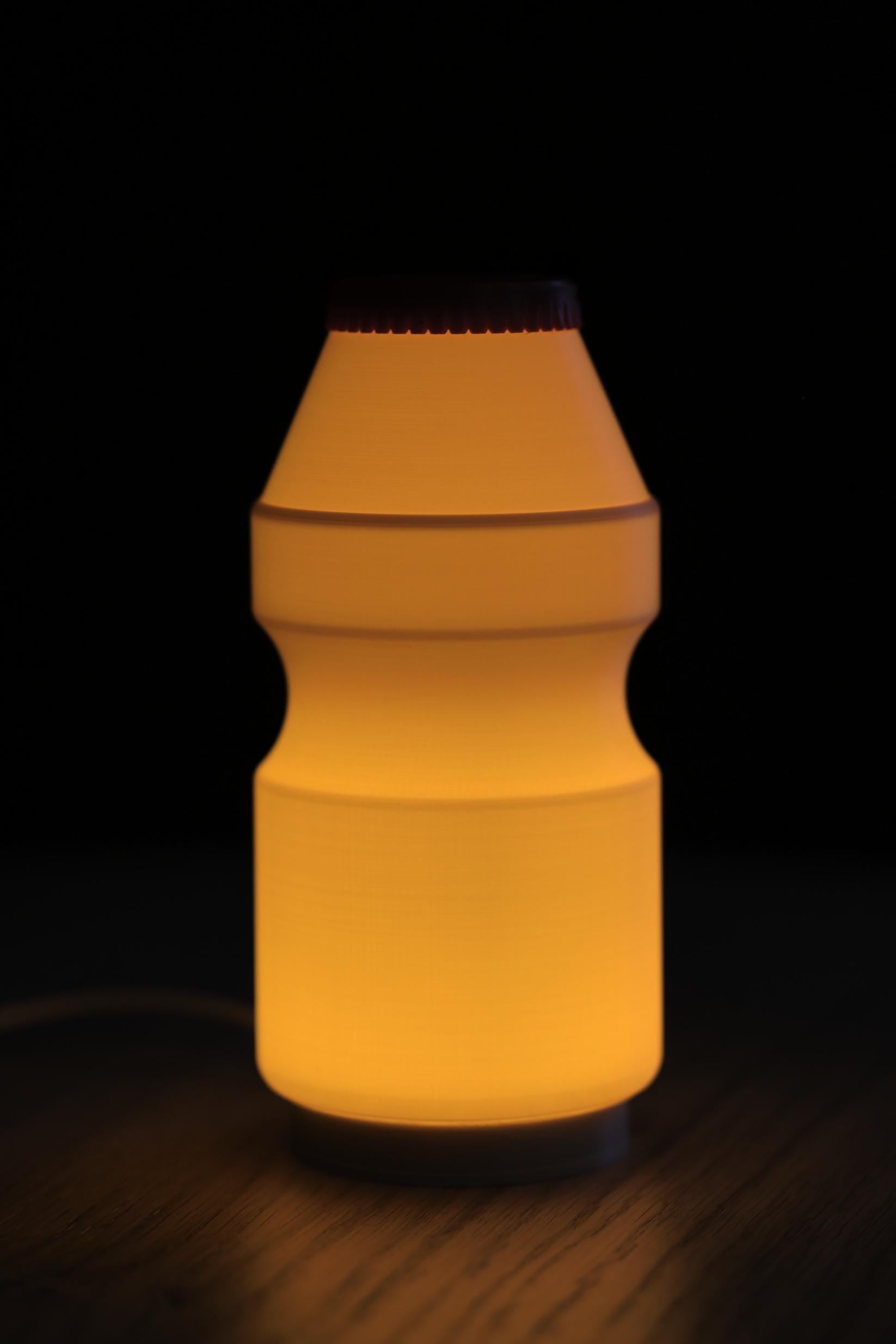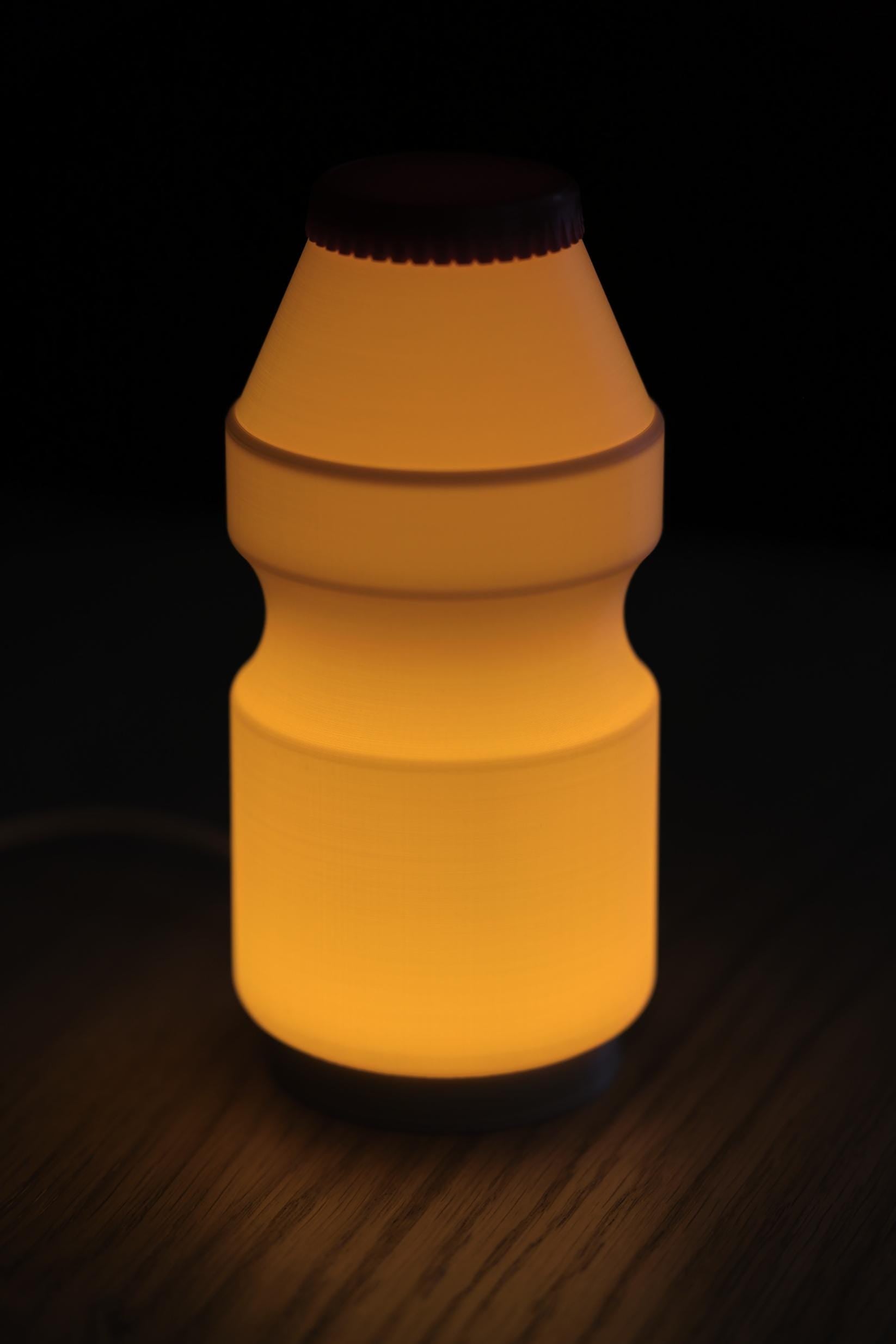 Add a fun and cozy touch to your space with a lamp shaped like the classic probiotic drink! We made it with the same proportions as the original bottle, but doubled in size so it really makes a statement. When you turn it on, it casts a warm, inviting glow—perfect for creating a relaxing vibe. The built-in LED light module has an in-line controller allowing you to adjust brightness and temperature (neutral, cool, warm). It receives power through a USB-A plug.