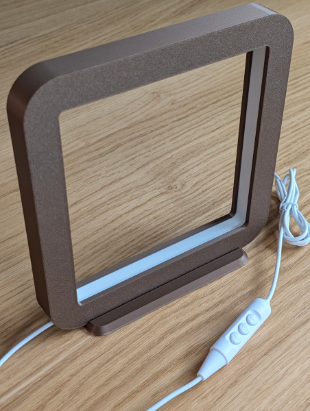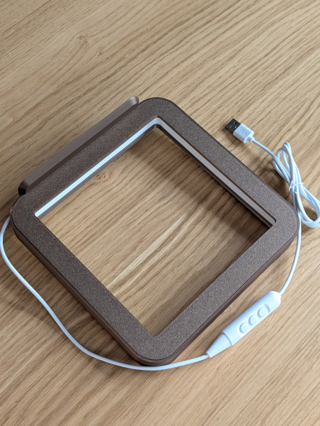 Because of the square ring lighting, this light can be used to highlight other objects near it, whether as a frame or backlight. The COB LED strip provides smooth light rather than showing individual discrete LED dots. The light controller has buttons to go up and down through its six brightness levels as well as a power button. This light uses a standard USB-A plug, so it can be powered by your computer, power bank, charging station, and more.